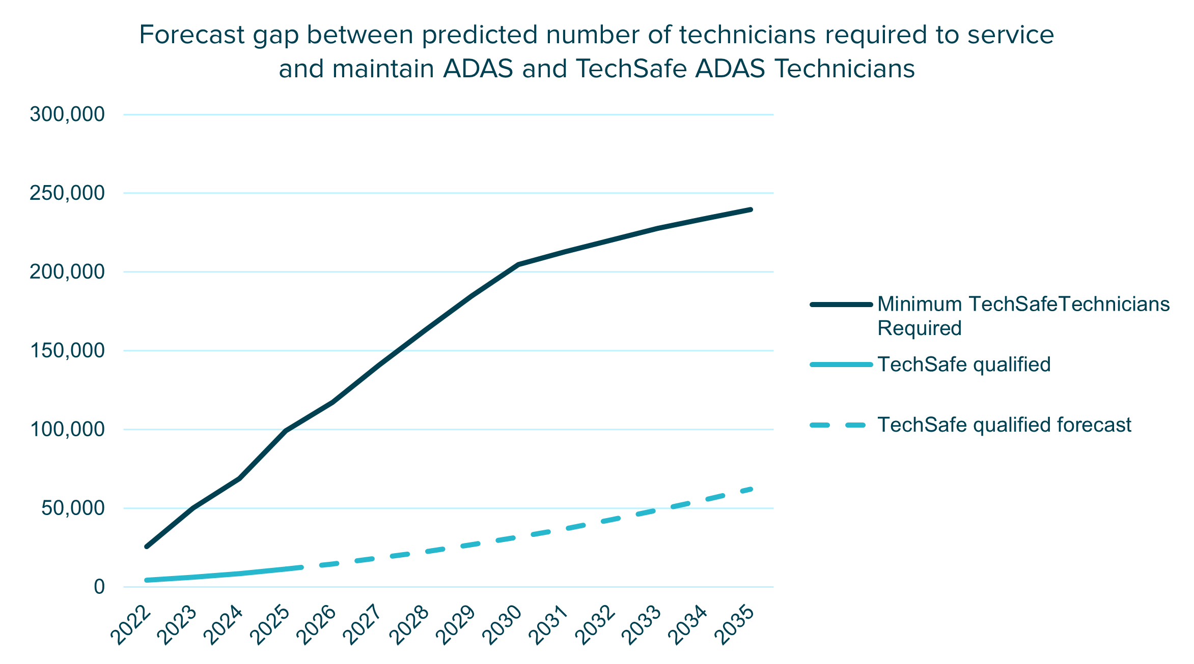 The data shows a widening gap between the number of technicians holding ADAS qualifications and the number forecast to be required as vehicle technology continues to advance.