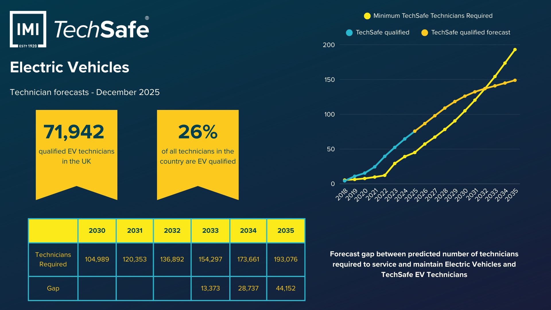 The latest IMI projections show that demand will outpace supply. The number of EV-qualified technicians could reach 193,000 by 2035, but the sector may still face a shortfall of more than 44,000 technicians.