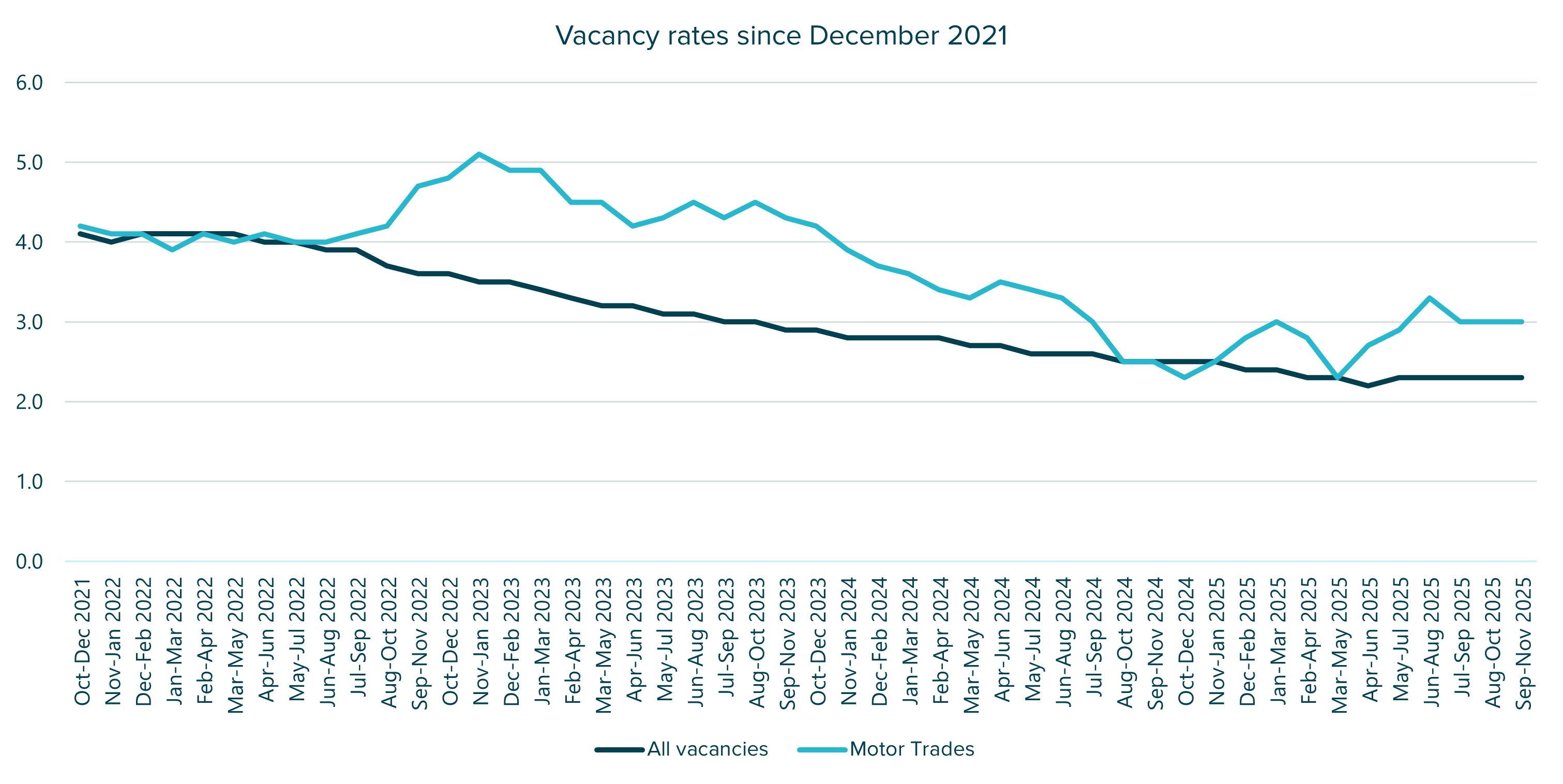 ONS estimates around 18,000 Motor Trades vacancies in October to December 2025, unchanged from late summer, following a temporary rise earlier in the year. - Recruitment pressure stays elevated