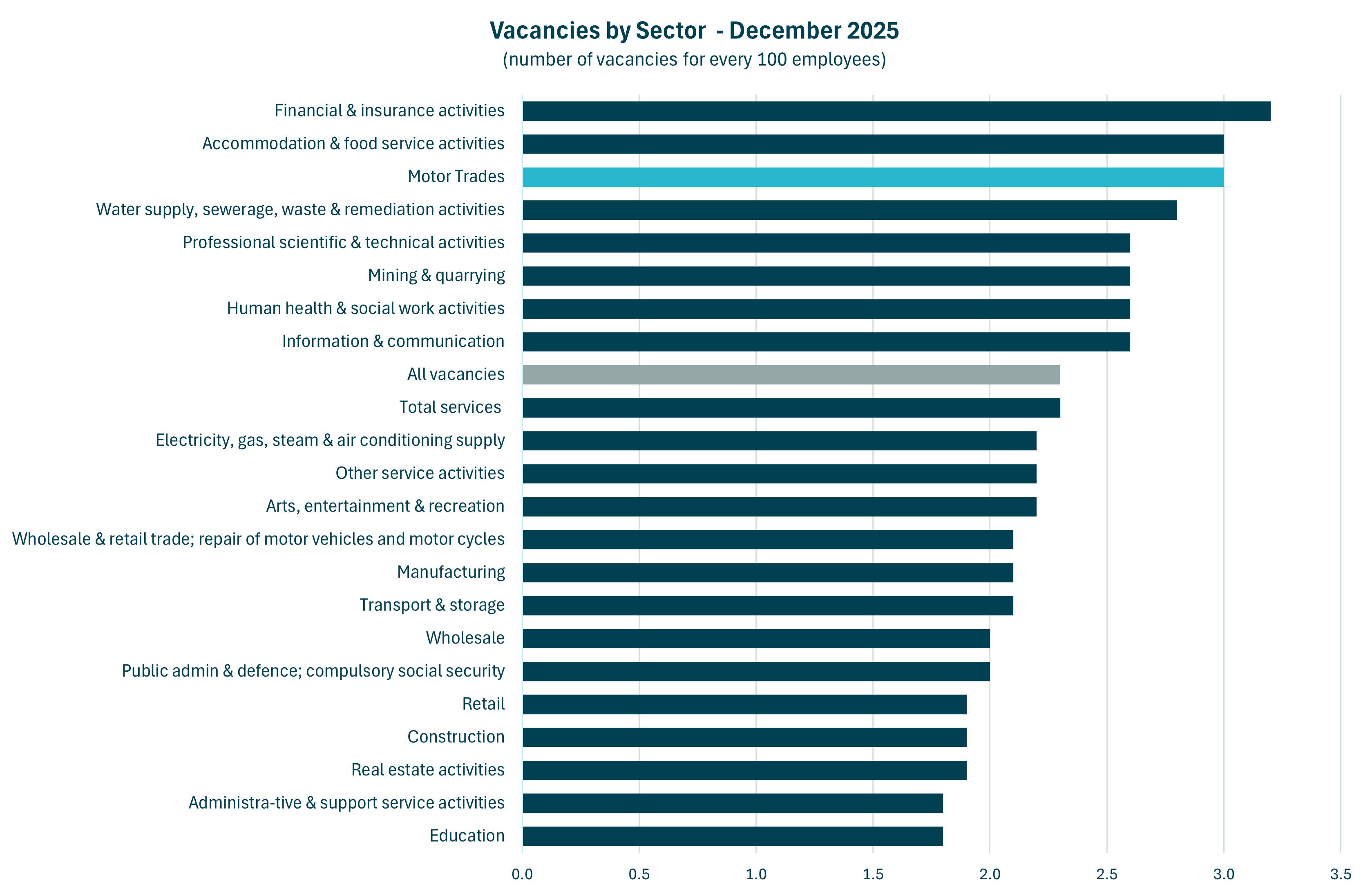 The Motor Trades now ranks third highest for vacancies, behind finance and accommodation and food services. This reflects ongoing hiring demand, even as the wider labour market softens.