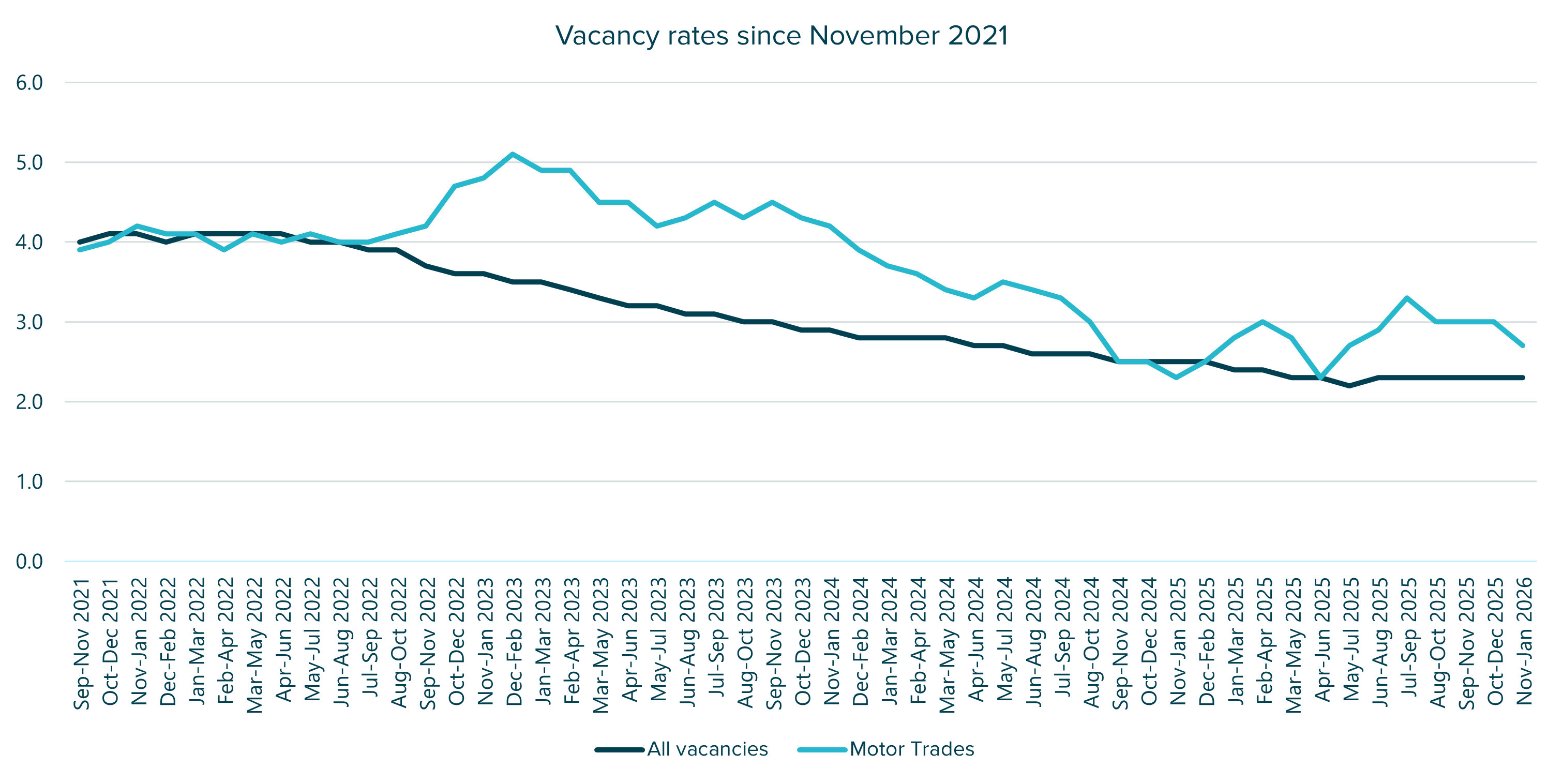 ONS data shows that Motor Trades vacancy rates peaked in 2022, declined through much of 2024, and stabilised during 2025, before easing slightly at the start of 2026.