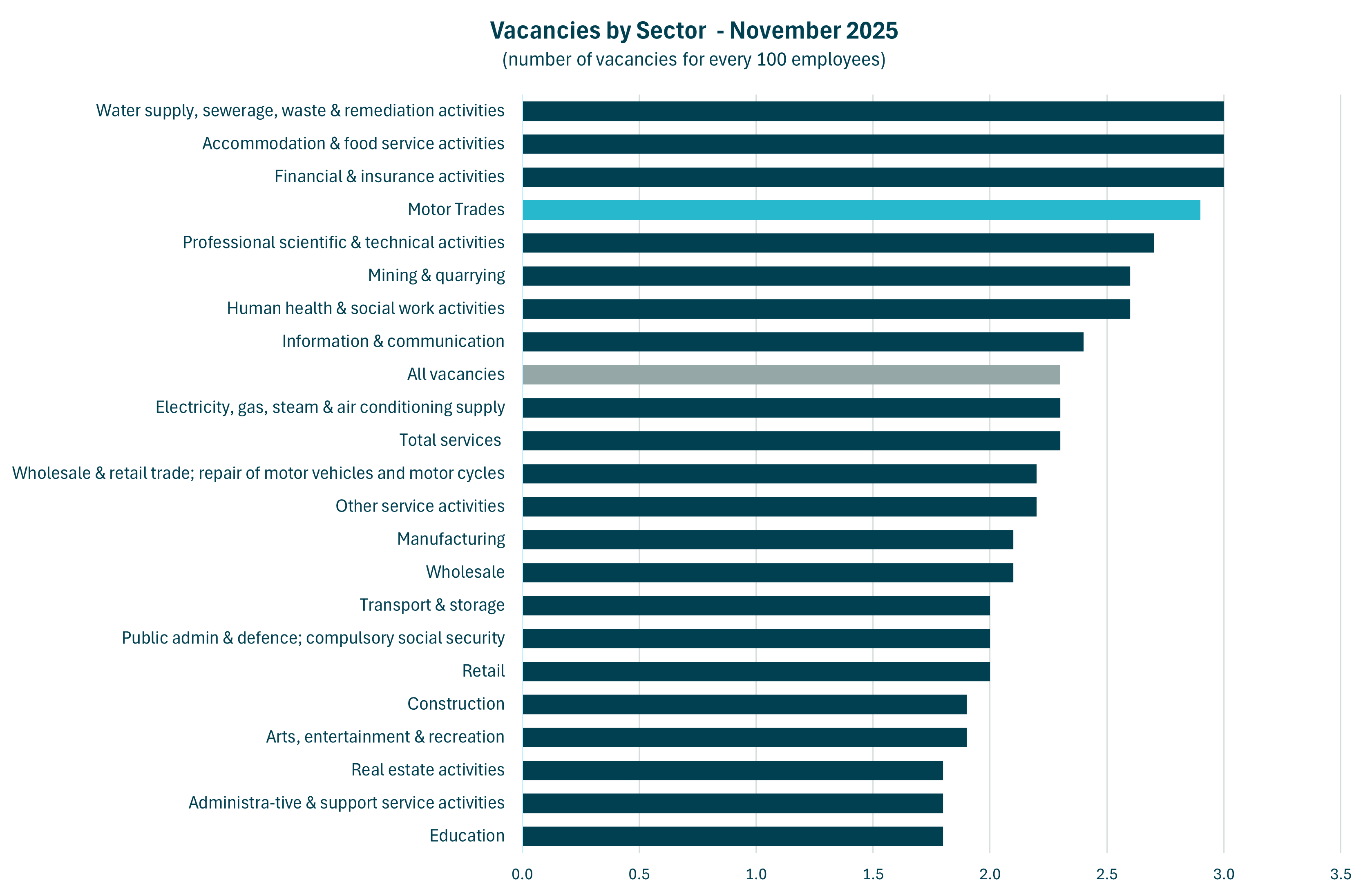 In September to November 2025, the Motor Trades vacancy rate stood at 2.9%, compared with 2.3% across the UK economy as a whole.