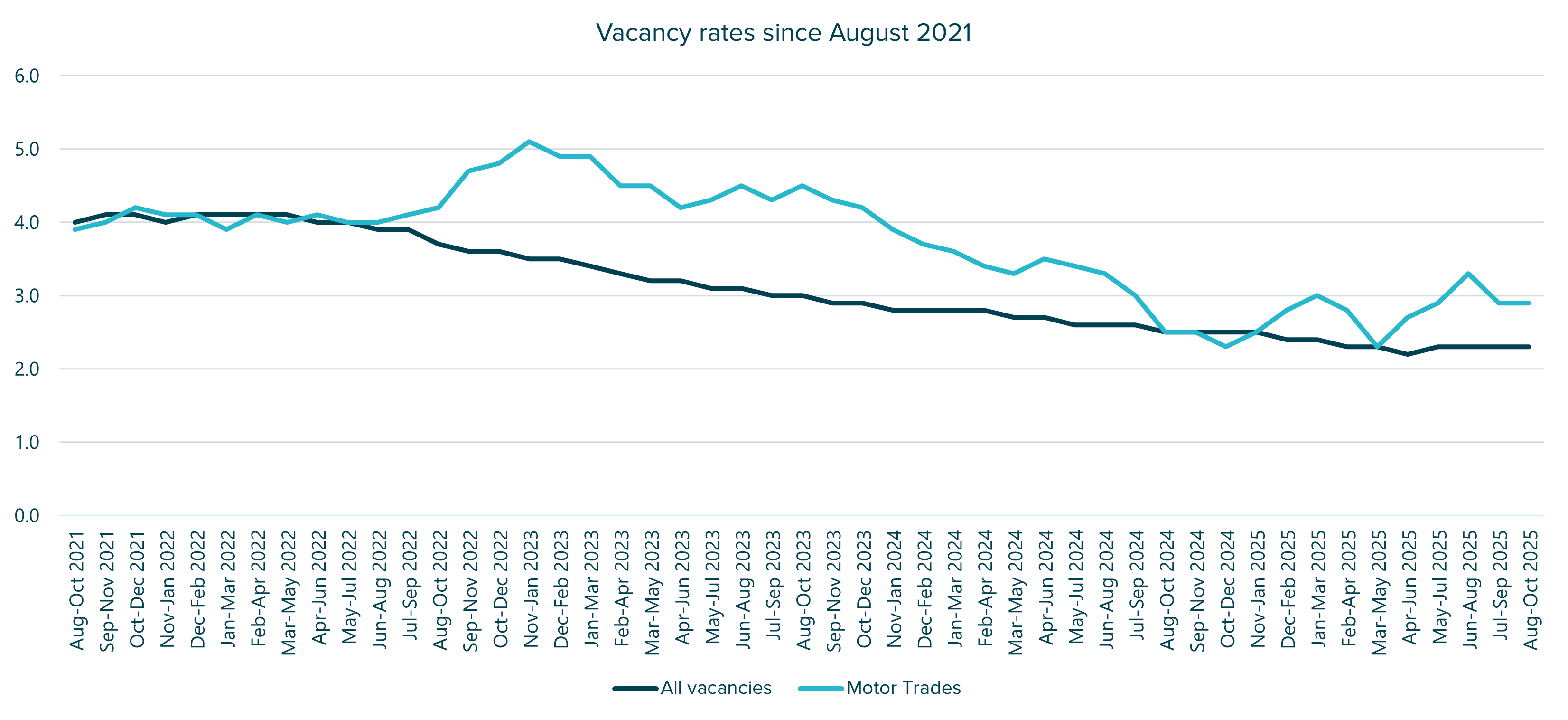 UK vacancy data shows that Motor Trades vacancy rates peaked in 2022, fell through much of 2024, and then stabilised during 2025.